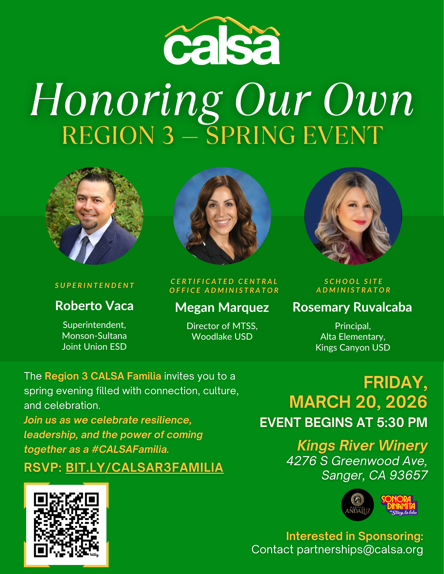 Join the Region 3 CALSA Familia for an evening of comunidad — celebrating our shared commitment to uniting educational leaders and strengthening opportunities for all students. Learn how CALSA continues to uplift and empower Latino/a leaders in education.