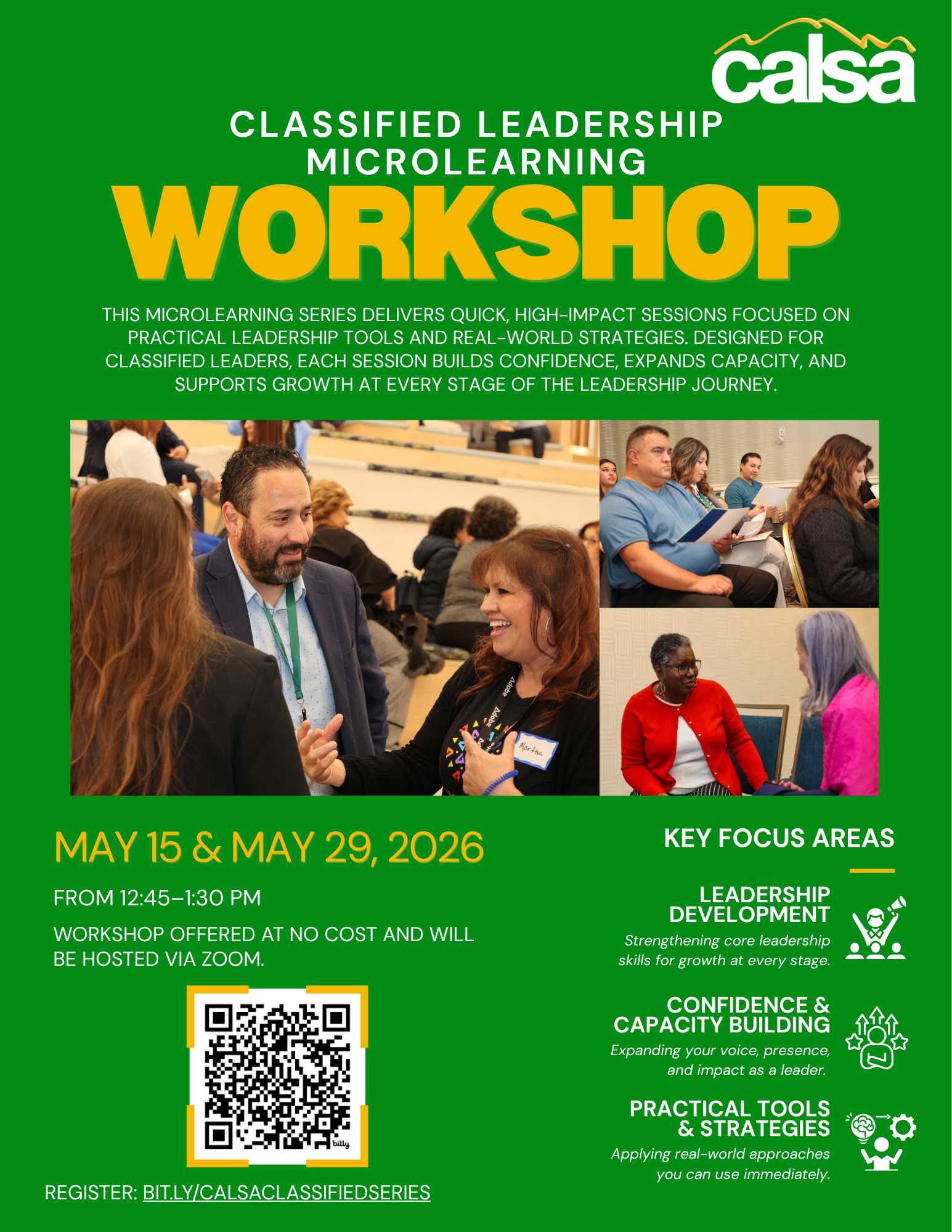 This Classified Leadership Microlearning Workshop Series is designed to strengthen the professional growth of classified leaders across California. Each short, high‑impact session delivers practical strategies, leadership tools, and real‑world applications to support emerging and aspiring leaders in every role. The series is intentionally crafted to build confidence, expand capacity, and elevate the essential contributions of classified professionals in our schools and communities.