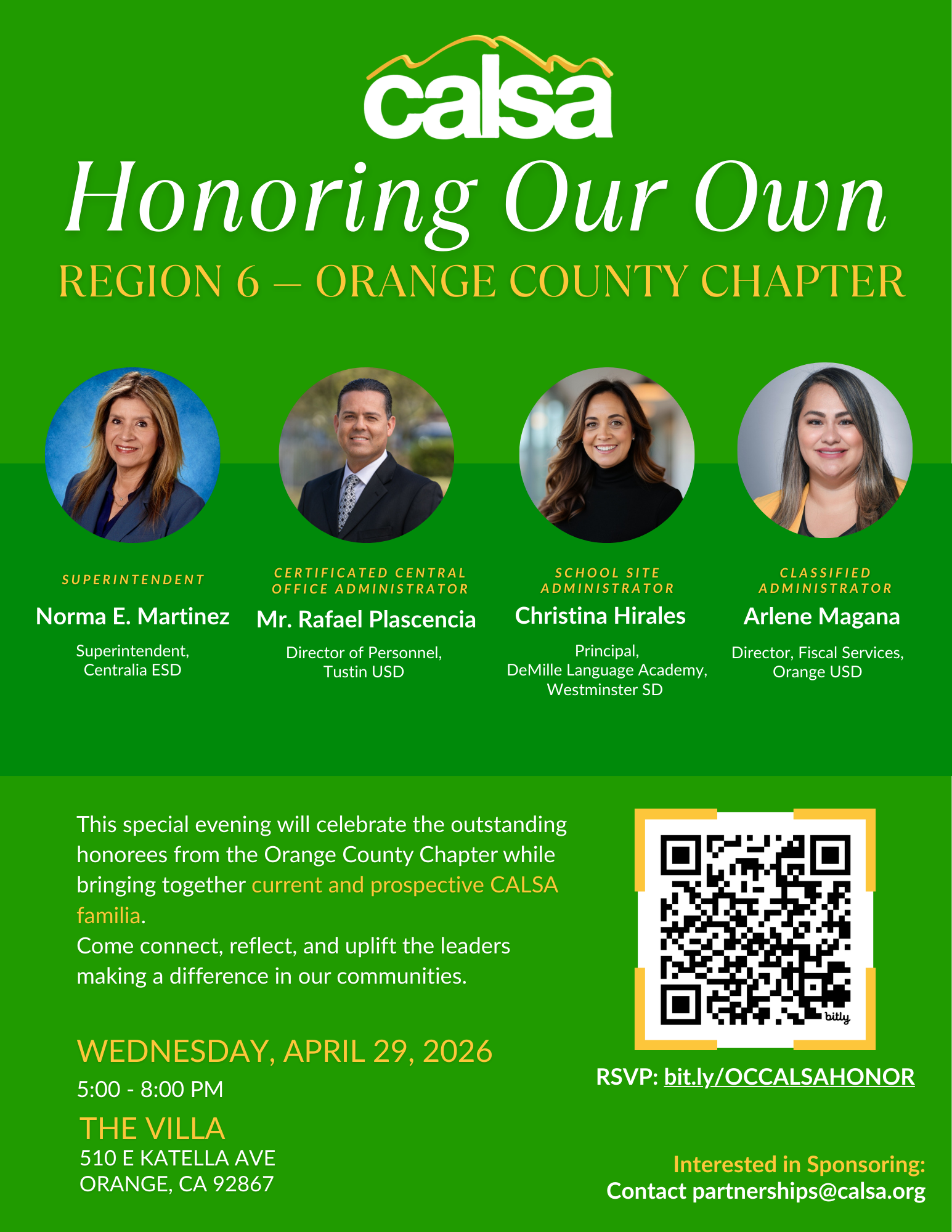 REGION 6, HONORING OUR OWN — ORANGE COUNTY CHAPTER Wednesday, April 29, 2026 5:00 PM 8:00 PM Google Calendar ICS This special evening will celebrate the outstanding honorees from the Orange County Chapter while bringing together current and prospective CALSA familia.Come connect, reflect, and uplift the leaders making a difference in our communities. RSVP