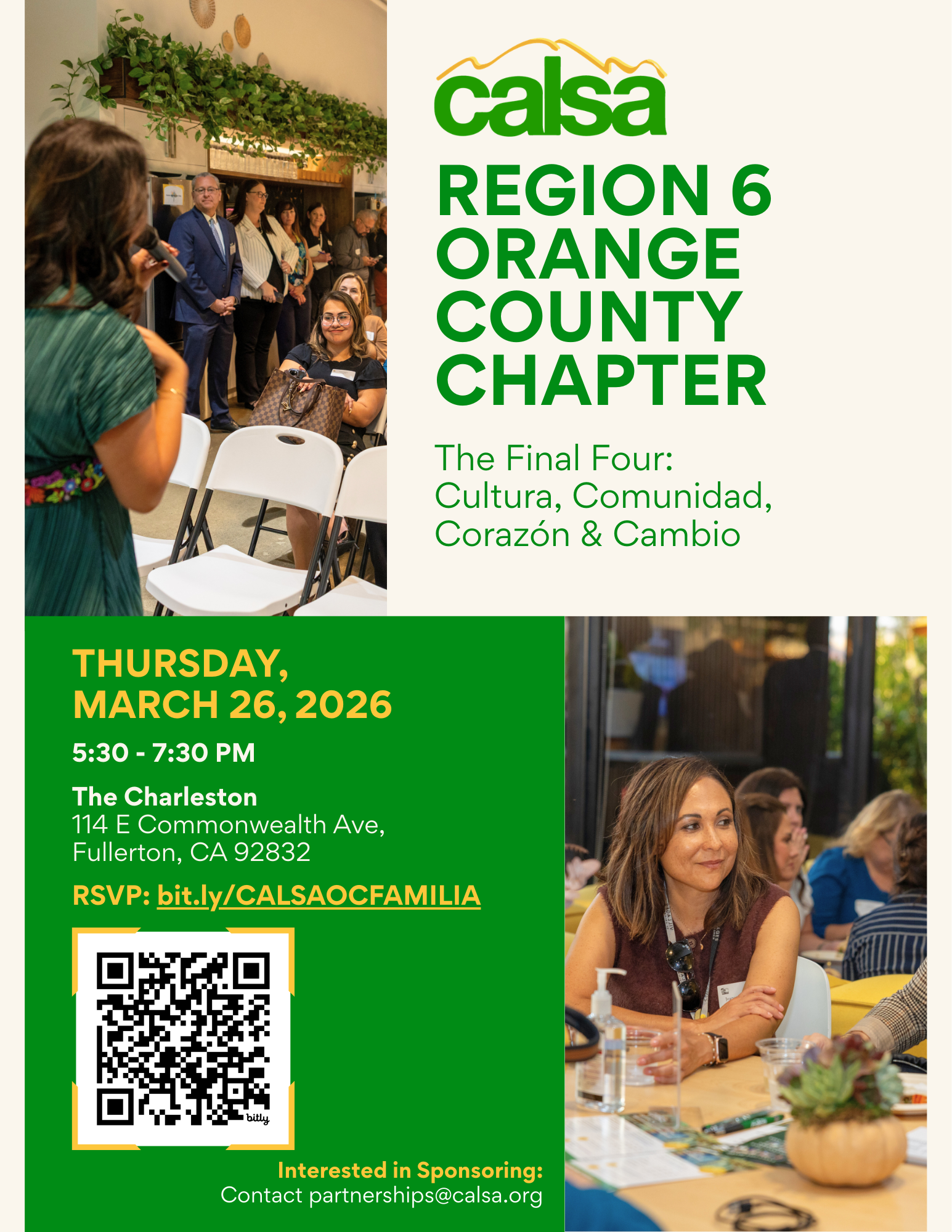 REGION 6 Orange County Chapter: The Final Four: Cultura, Comunidad, Corazón & Cambio Thursday, March 26, 2026 5:30 PM 7:30 PM Google Calendar ICS The Region 6 CALSA Familia invites you to an evening of connection, culture, and celebration in Orange County. Join fellow leaders as we come together to strengthen community and celebrate leadership. RSVP